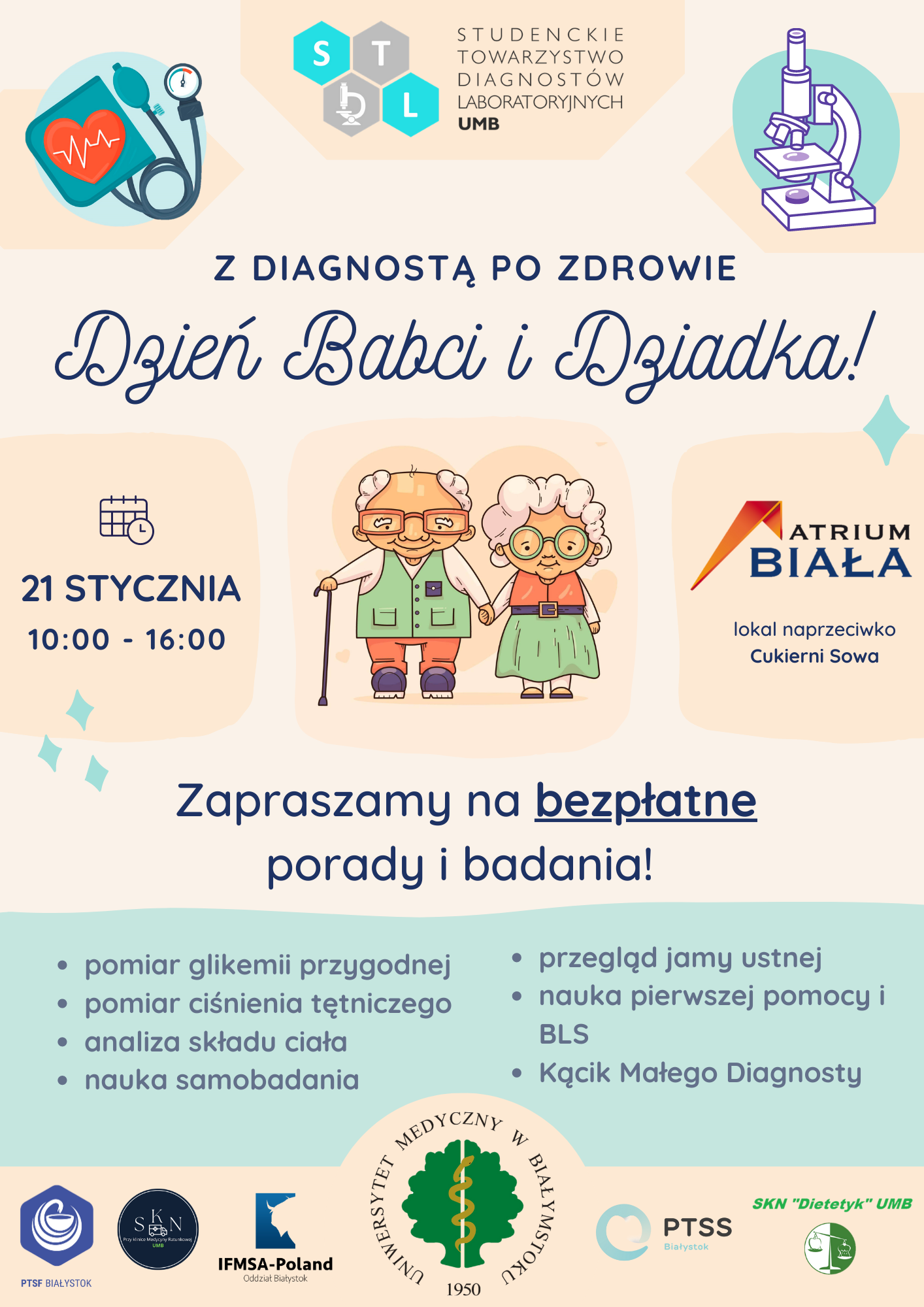 21sty2023 Dzień Babci i Dziadka Białostocka Akademia Rodziny zaprasza na bezpłatne badania i porady dla seniorów. autor: Białostocka Akademia Rodziny Tweetnij